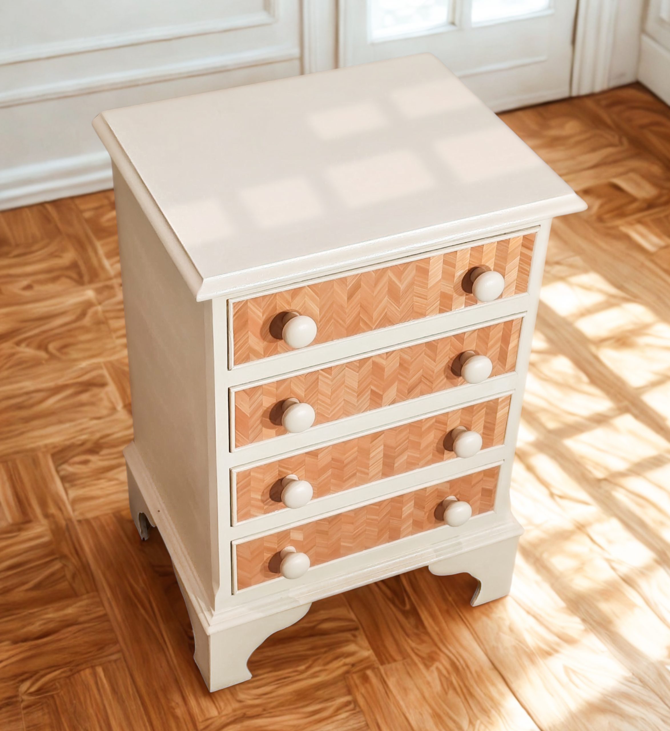 La marqueterie de paille vient souligner les lignes, révéler la matière et apporter une identité singulière à chaque meuble.